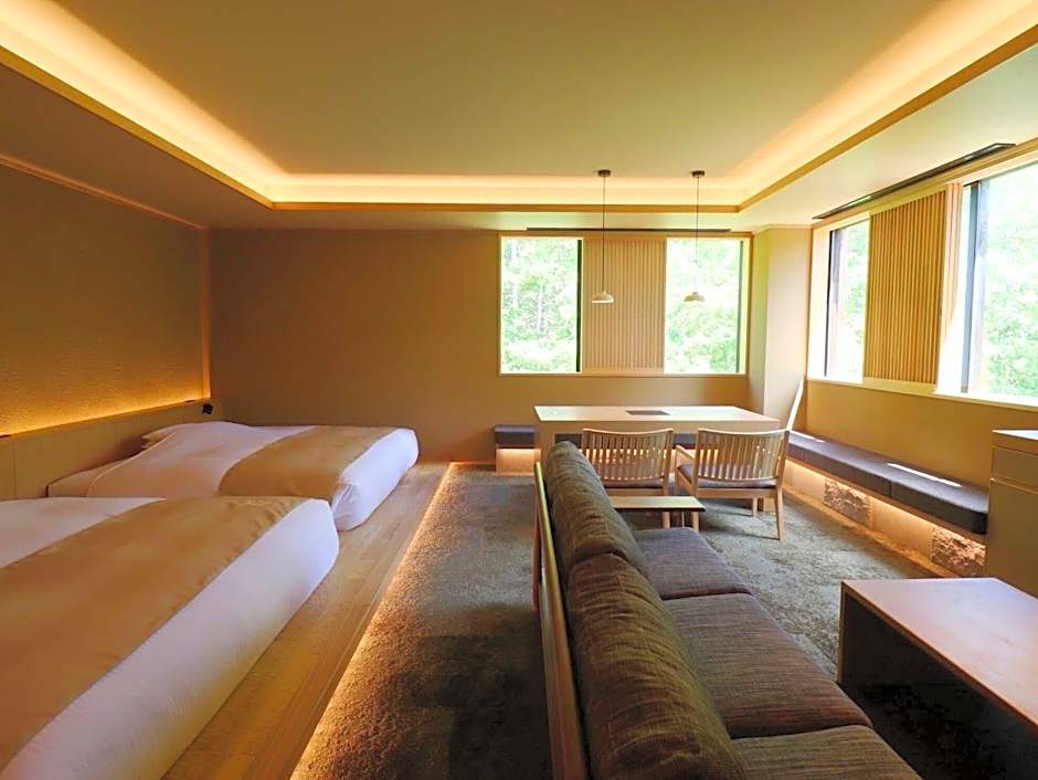 This suite has air conditioning and flat-screen TV. The meals in your room prepared by the hotel are shabu-shabu. Our staff will bring the meal to your room so you can cook and eat it yourself. In order to respect the privacy of our guests, our staff generally do not enter your room. Please note that setting up, light cooking, warming up and taking down the food to your private door is completely self-service.